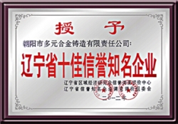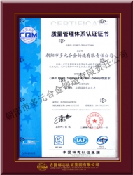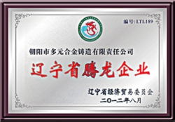 公司于2001年通過IS9001-2000質量管理體系認證,生產(chǎn)的多元牌高錳鋼鑄件于2005年榮獲"遼寧省名牌產(chǎn)品"稱號。